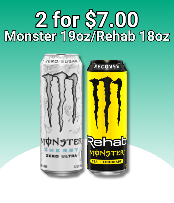 Monster Energy® 19.2oz and Rehab® 18.6oz – 2 for $7.00